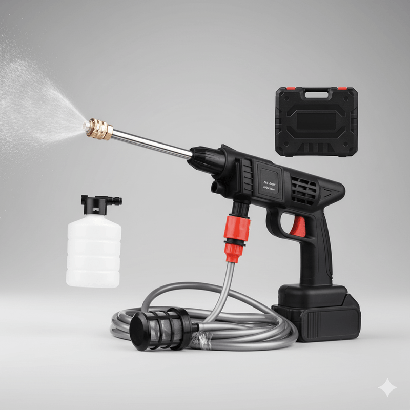 Lava tu carro, moto, bici o terraza en cualquier lugar. Sin necesidad de manguera ni enchufe. Batería recargable y presión profesional. La libertad de limpiar donde quieras.